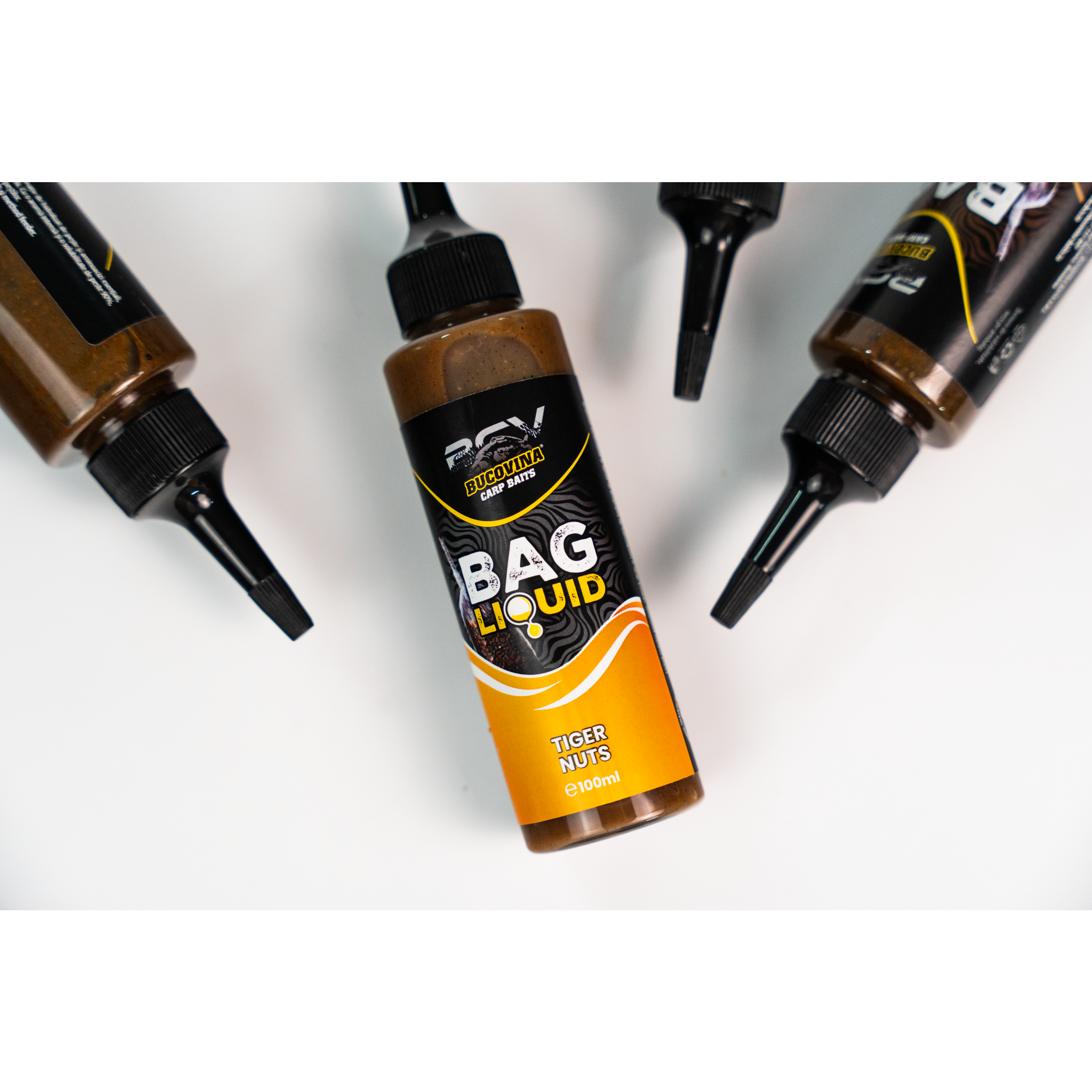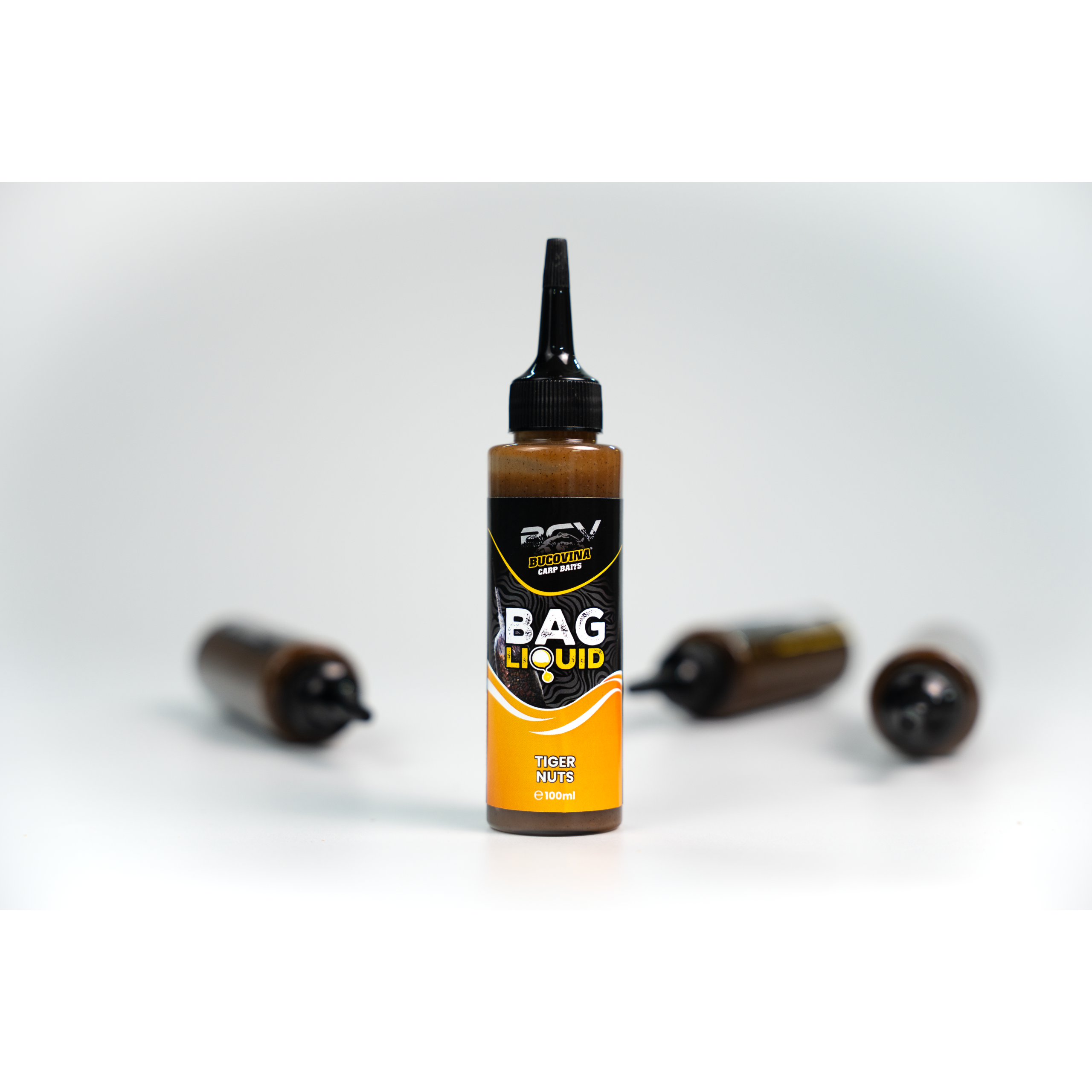 Bag Liquid este un lichid nutritiv de mare atracție, cu aromă intensă de Tiger Nuts, special conceput pentru pescuitul cu pungi și săculeți solubili. Conține extract pur de Tiger Nuts, un ingredient recunoscut pentru eficiența lui în atragerea crapului, chiar și în condiții dificile.