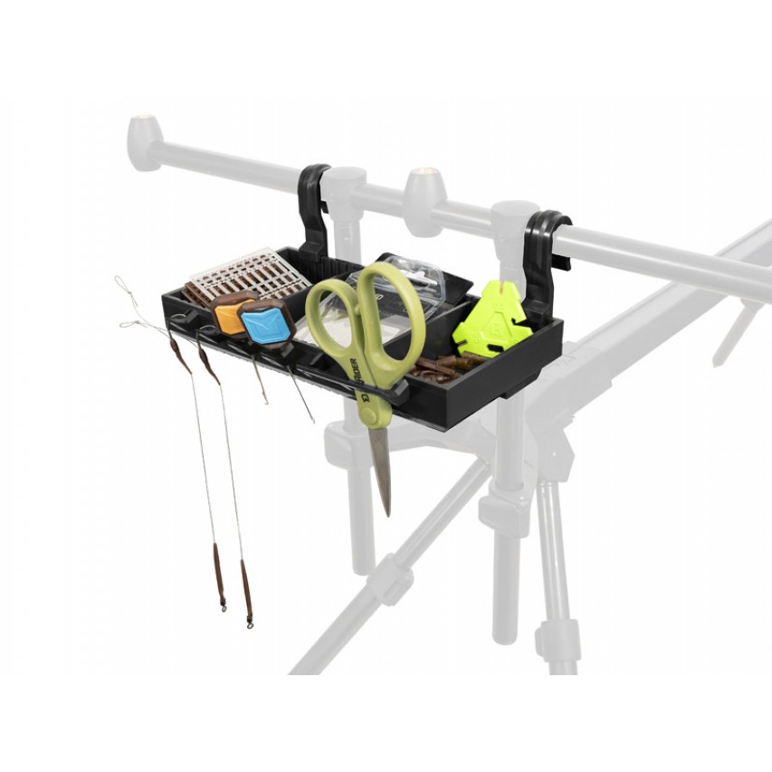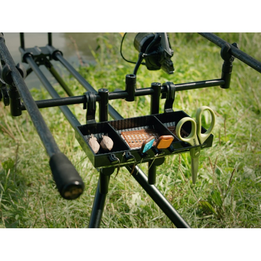 ShelfPOD are margini ridicate pentru a-ți menține echipamentul în siguranță. Partea de jos este perforată pentru scurgerea apei atunci când plouă. Două cârlige puternice din plastic îți permit să agăți cu ușurință raftul pe suport, iar deoarece acestea pot fi detașate, poți transporta raftul în cortul de pescuit (bivvy) sau îl poți pune pe o masă.