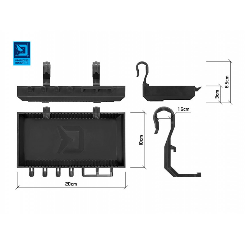 Delphin ShelfPOD are montate, în față, cârlige pentru a-ți putea agăța monturile. Acestea pot fi folosite pentru cârlige, foarfece sau alte accesorii mici. Separatorii detașabili îți permit să optimizezi spațiul de depozitare în funcție de nevoile tale. Raftul este conceput în cunoscutul design BlackWAY și se potrivește foarte bine cu suporturile noastre.